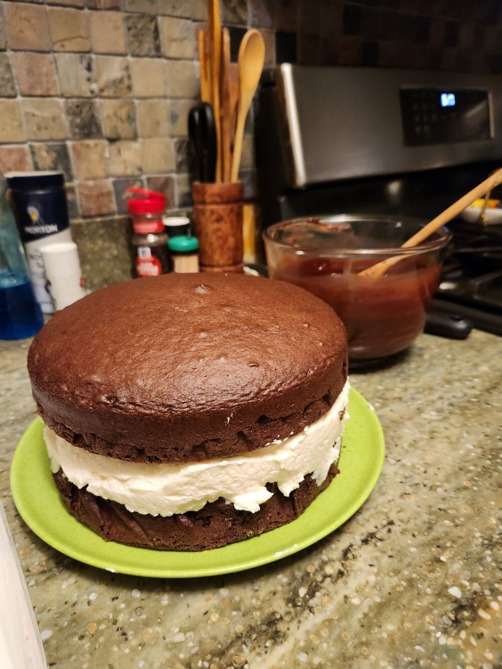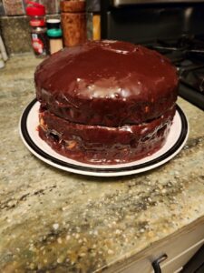 After mopping up the mess, I let it set, then tried again. By this time, the ganache had thickened just enough to cover the cake. But my sloppy filling betrayed me—poking through here and there, smearing into the glossy chocolate.
