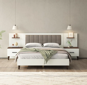 A statement headboard instantly elevates the room. Some designs even include built‑in nightstands for a sleek, custom look. Pair this with soft neutral bedding and warm lighting for a balanced, modern feel.