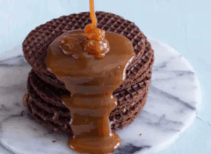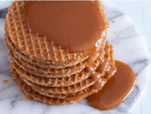A stroopwafel (pronounced stroop-waa-fuhl) is a Dutch treat thatâs as fun to say as it is to eat. Itâs made of two thin, crisp waffle cookies pressed together with a gooey caramel syrup filling. The name literally means âsyrup waffleâ in Dutch, and itâs traditionally enjoyed perched atop a steaming cup of coffee or teaâsoftening the center and releasing its cinnamon-scented magic.