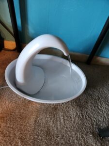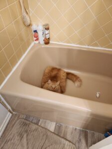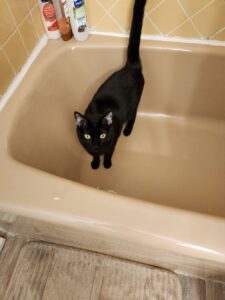 I left the bathroom door open. After all, it wasn’t night time and it’s usually open during the day. Big mistake. Banner redirected his efforts from the water fountain to the medicine cabinet. Then he resumed his serenade in the tub. Cries echoing throughout the apartment.